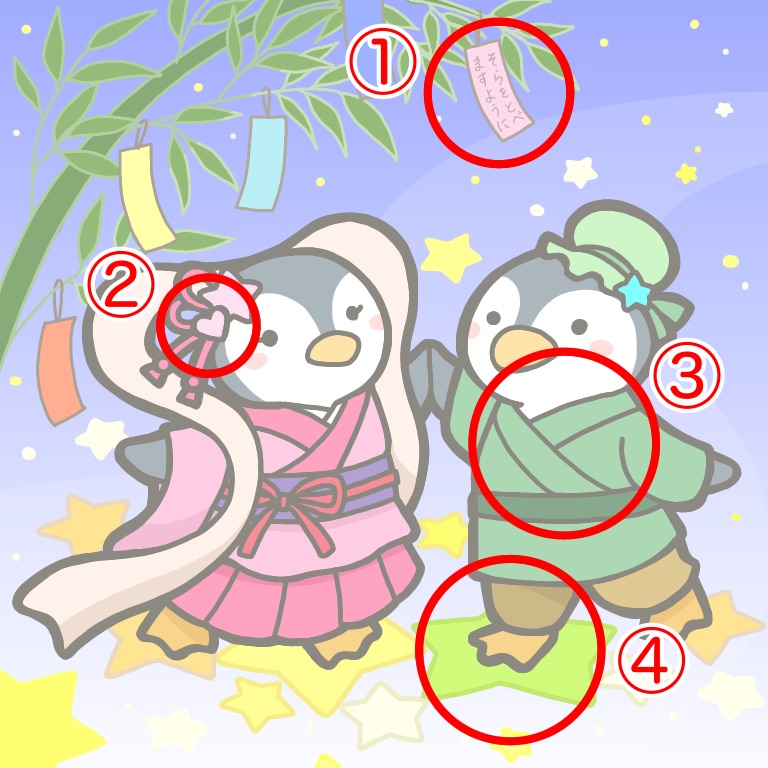 動物イラスト|間違い探しクイズ⑬【初級編】 スポンサーリンク 間違いさがしクイズ X Facebook0 はてブ0 LINE Pinterest 2022.07.052022.10.27 間違いさがしクイズ初級編 天あまの川がわで1年ねんぶりの再会さいかいをよろこんでいる 織姫(おりひめ)ペンギンぺんぎんと彦星(ひこぼし)ペンギンぺんぎん ロマンチックろまんちっくな夏なつの夜空よぞらのイラストいらすとだよ♪ ①と②の2つの絵えをくらべると、違ちがうところが4個こあるよ。 4個こぜんぶ見みつけれるかなー ① ② おつかれさまでした。 答こたえはここをひらいてね~ ↓↓↓ 答え ① 短冊たんざくに願ねがい事ごとが書かいてある ② 形かたちが違ちがう ③ 着物きものの合あわせ方かたが逆ぎゃく ④ 星ほしの色いろが違ちがう >>間違い探しクイズ⑭【初級編】へ 動物間違いさがし|他のページ 【春のイラスト】 ⑨-1 / ⑨-2 / ⑩ / ⑪ 【夏のイラスト】 ⑫ / ⑬ / ⑭ 【秋のイラスト】 ① / ② / ③ / ④ / ⑤ 【冬のイラスト】 ⑥ / ⑦ / ⑧